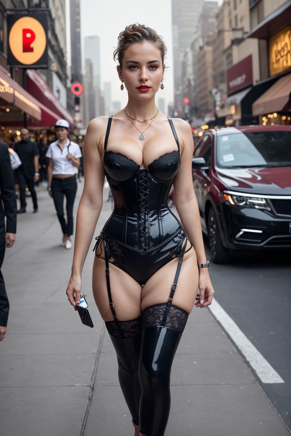 1girl, (full body shot:1.2), depict a woman walking in street, wearing blue waist-corset only, expensive laced mary corset, busty, exposed breasts, extra gigantic breasts, cleavage, exposed pussy, pussy cleavage, puffy pussy, bare thigh, platform stiletto ankle strap high heels, thick lips, lipstick, makeup, blush, wide hip, thick thigh, shiny skin, crowd, NY manhattan street, skyscrapers, night, lights, neon signs, looking away, smartwatch, necklace, earrings, (masterpiece:1.3), extremely high details, (best quality:1.3), absurdres, (photorealistic), realistic, hyper-detailed, ray-tracing, high resolution, sharp focus, 8k, vibrant, intricate, sharpness and clarity, lifelike, hyper_realism