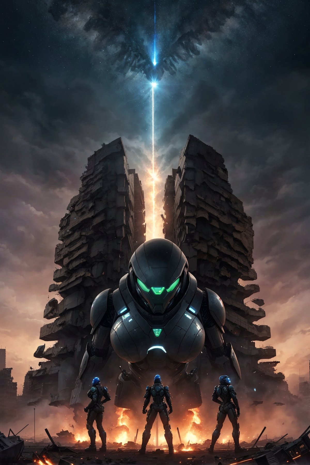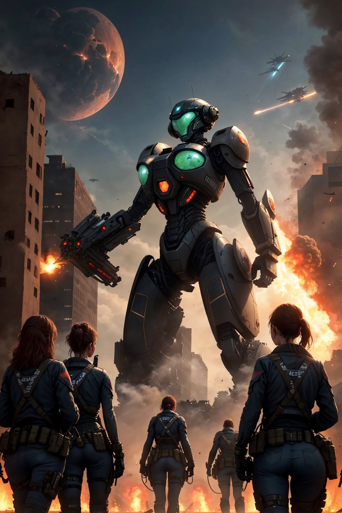 alien attacking earth, depict epic fighting scene of giant female sexy humanoid robot and earth defense military unit against aliens, a color-painted giant sexy female humanoid robot artificial robot pussy, huge round metal breasts, standing with defense unit soldiers and tanks together, fighting against aliens, alien attack, alien spaceship in sky, New York, demolished buildings, explosion, fire, smoke, aliens, (masterpiece:1.3), extremely high details, (best quality:1.3), absurdres, high resolution, hyper-detailed, ray-tracing, vibrant, intricate, sharpness and clarity