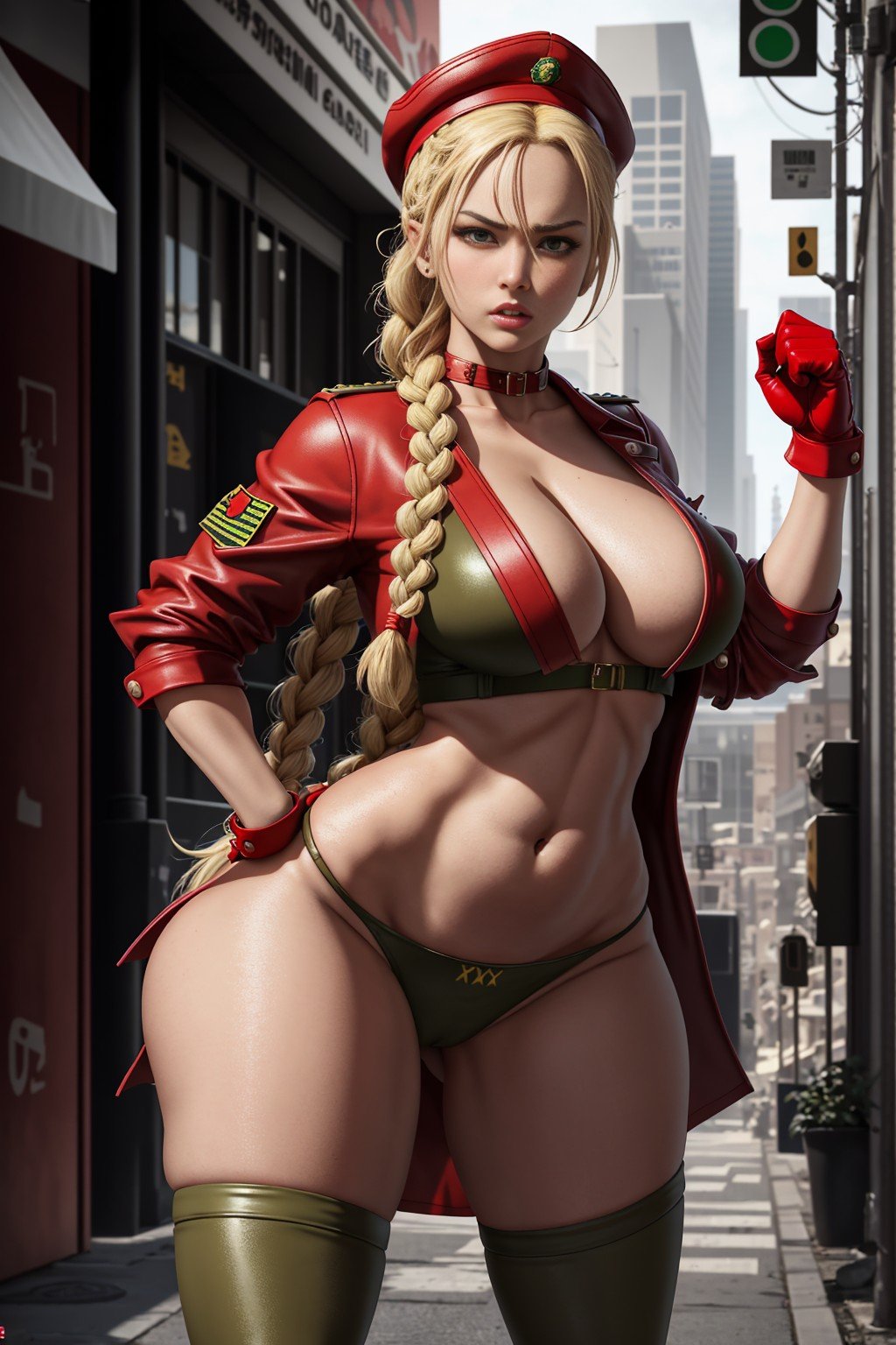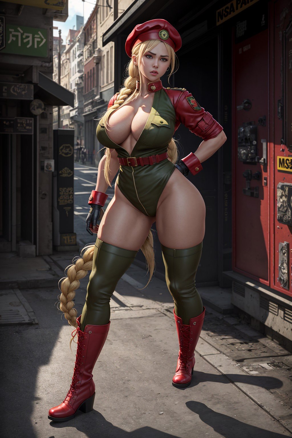 masterpiece, extremely high details, photo realistic, hyper-detailed, ray-tracing, best quality, high resolution, sharp focus, 8k, vibrant, intricate, sharpness and clarity, lifelike, hyper_realism, 1girl, solo, full body, depicting Cammy of Street Fighter PC game, red berret, green or blue suit, extra long braid hair, blonde hair, big boobs, boy face, angry, thick thigh, big butts, knee high military boots, red gloves, action, fighting, tae know do pose,