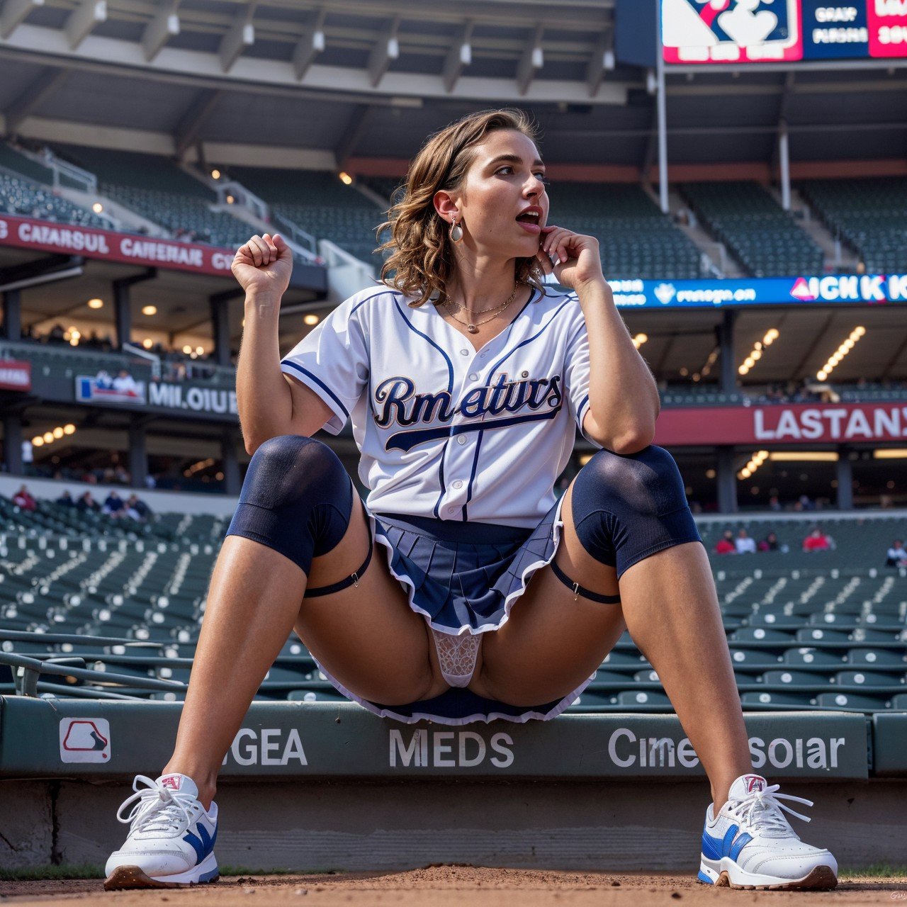 cute girl sitting in baseball stadium seat and cheering, crowd in seats, mlb stadium, 1girl, (full body:1.3), looking away, rich woman, earring, makeup, blush, lipstick, casual clothes, t-shirt, sandals, (full body:1.3), huge boobs, cheering, hands up, (wear mini-skirt:1.3), (spread legs):1.3, exposed pussy under skirt, pubic hair, dildo, insert dildo into vagina, riding dildo, oozing white sperm out of pussy, crowd, people around, depth of field, (masterpiece:1.3), (best quality:1.3), extremely high details, absurdres, (photorealistic), realistic, hyper-detailed, ray-tracing, high resolution, sharp focus, 8k, vibrant, intricate, sharpness and clarity, lifelike, hyper_realism