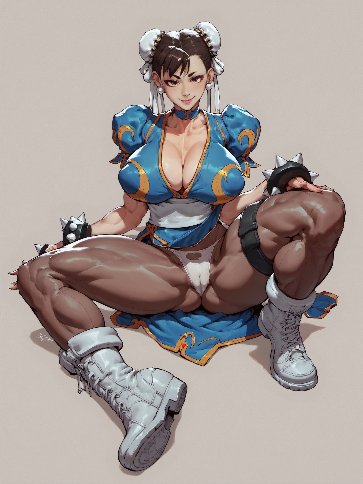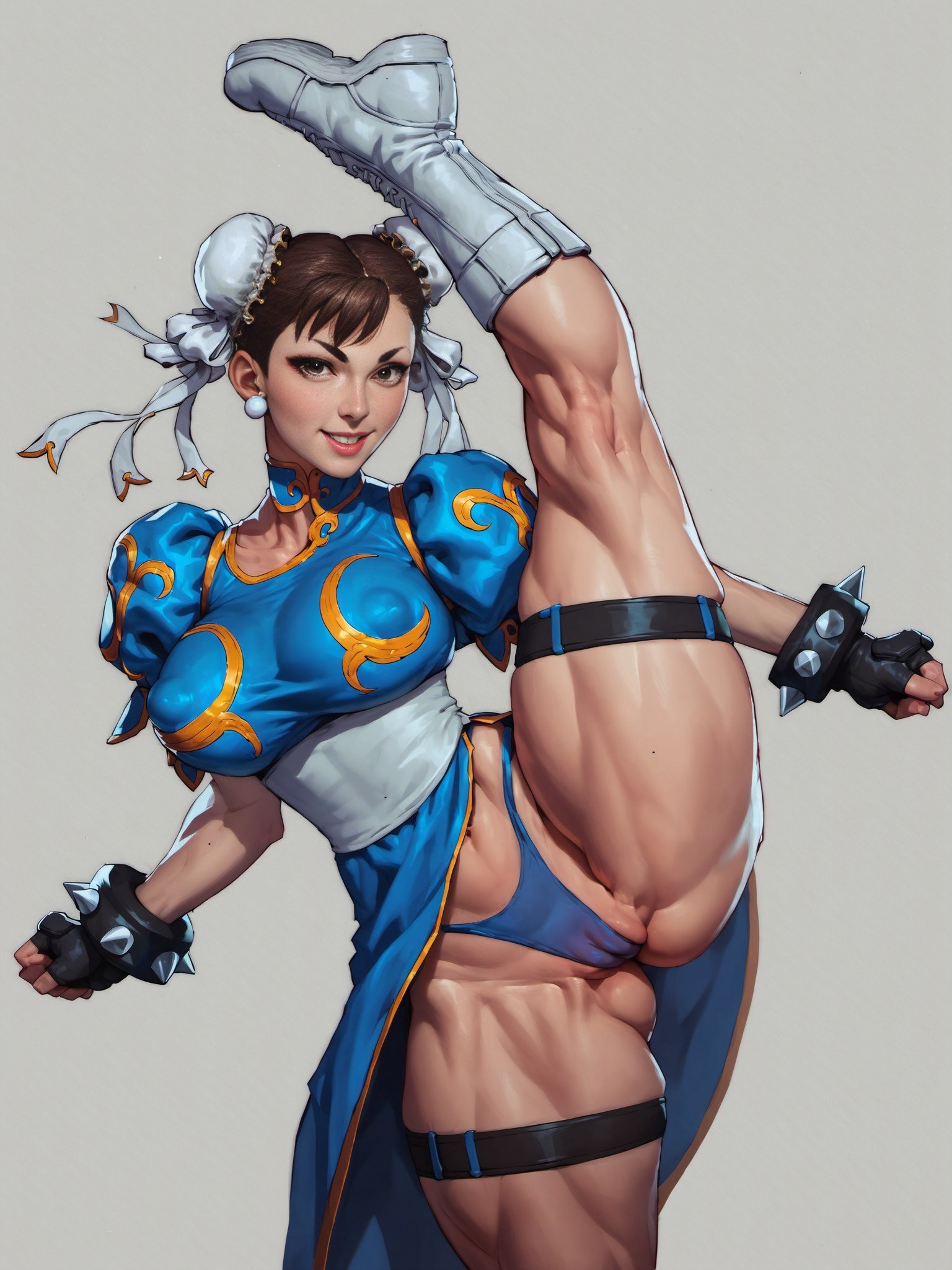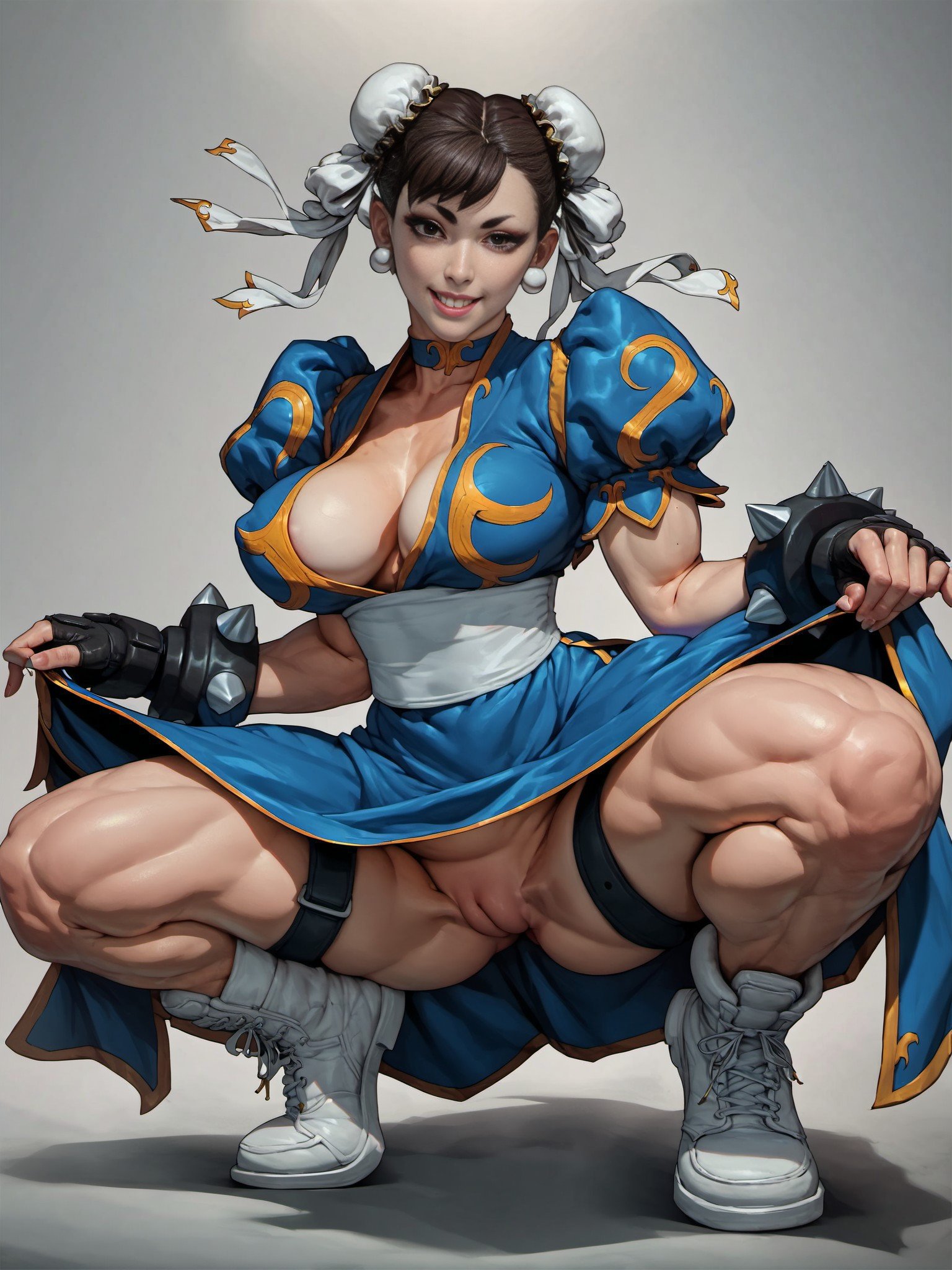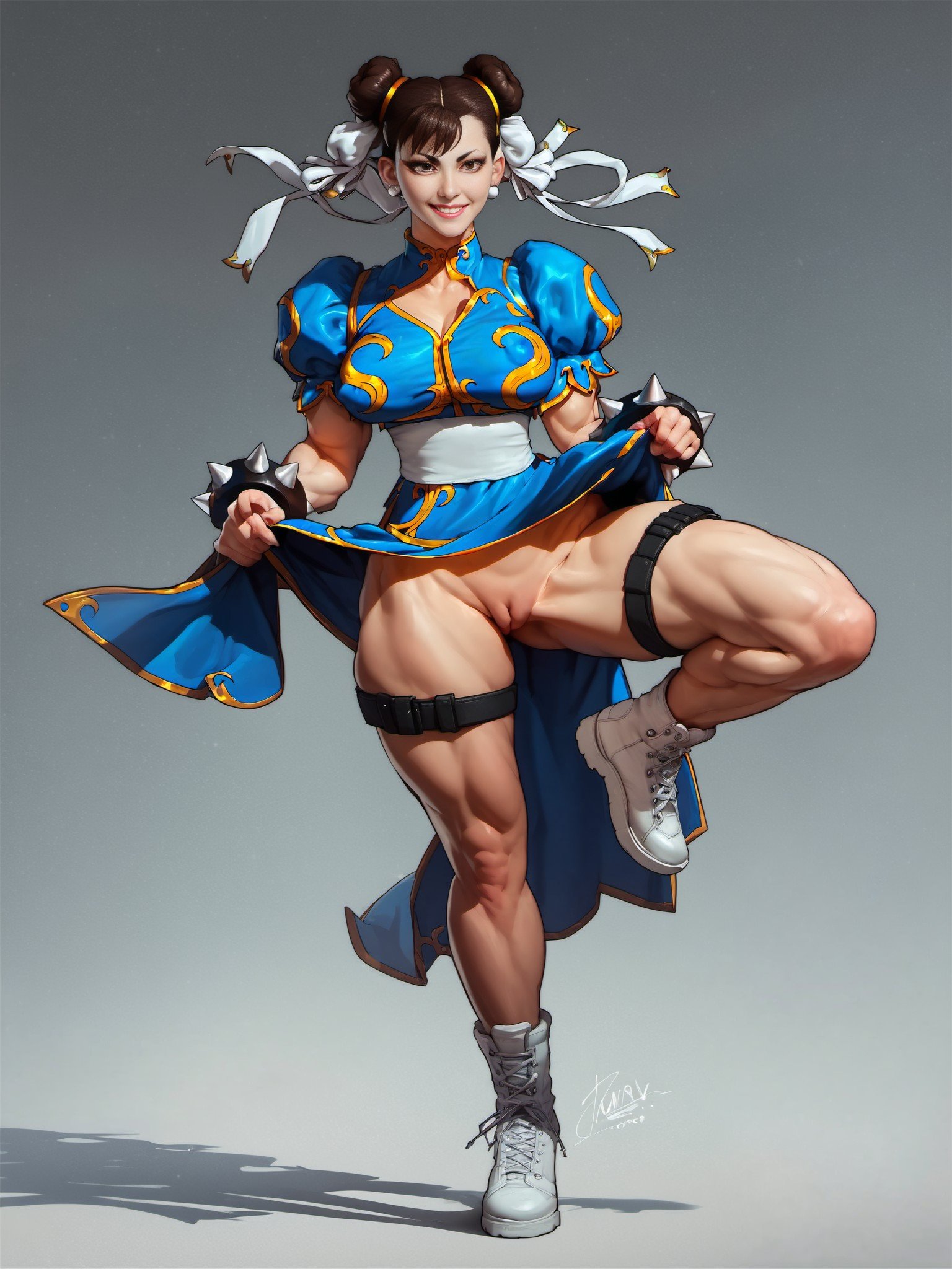 score_9, score_8_up, score_7_up, score_6_up, score_5_up, score_4_up, nsfw, full body, street fighter character Chun Li standing, cowboy shot, spreading legs, smile, big breasts, shirt open, popped-out breasts, cleavage, puffy big nipple popped-out, chun li costume, choker, gloves, exposed puffy pussy, huge cameltoe, skirt lifted, boots, thigh belt, big asses, thick thigh, simple background in studio, <lora:Concept Art Ultimatum Style LoRA_Pony XL v6:0.7>, realistic photography