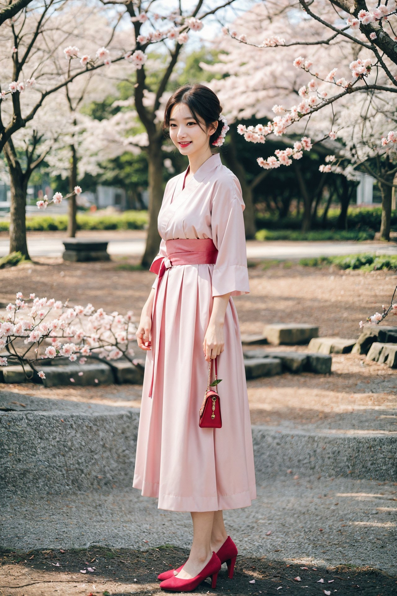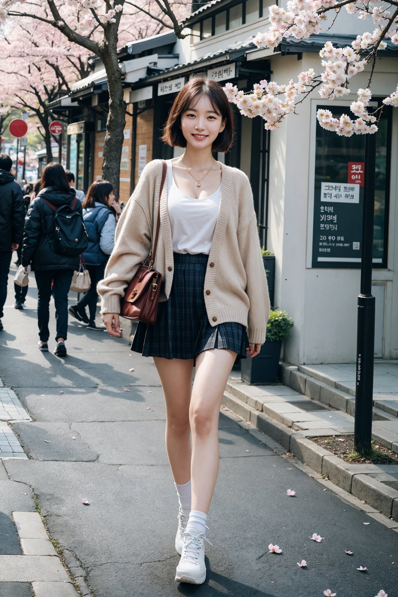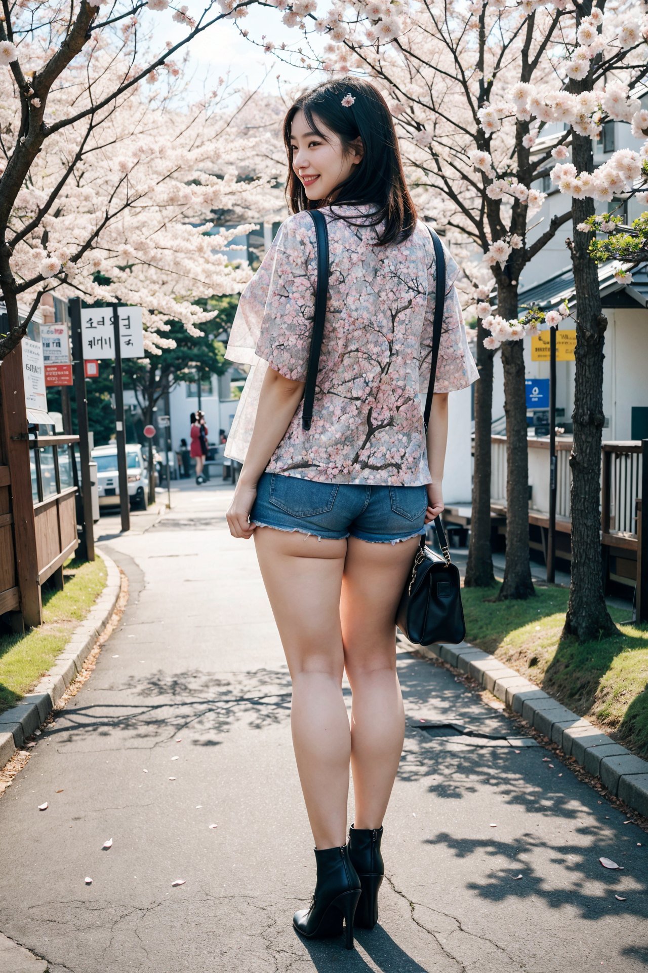 1girl, (full body:1.3), 22 years old korean woman walking through crowd at cherry blossom festival, round face, small face, small eyes, pastel gree tight leggings, bgi cameltoe, big boobs, cleavage, beautiful clothes, smile512, thick thigh, high-heels, bag, crowd, people around, cherry blossom trees, petals fly in air, park in korea, view from front,<lora:weight_slider_v2:0.45>, depth of field, (best quality:1.3), extremely high details, absurdres, (photorealistic), realistic, hyper-detailed, ray-tracing, high resolution, sharp focus, 8k, vibrant, intricate, sharpness and clarity, lifelike, hyper_realism