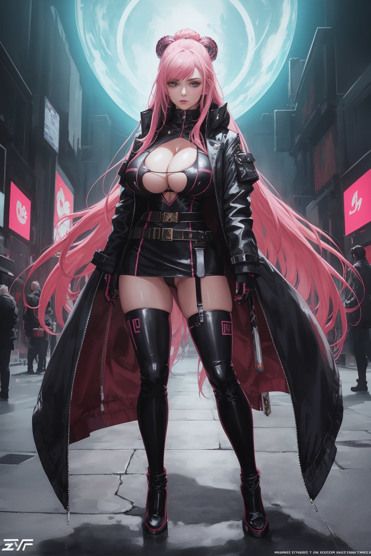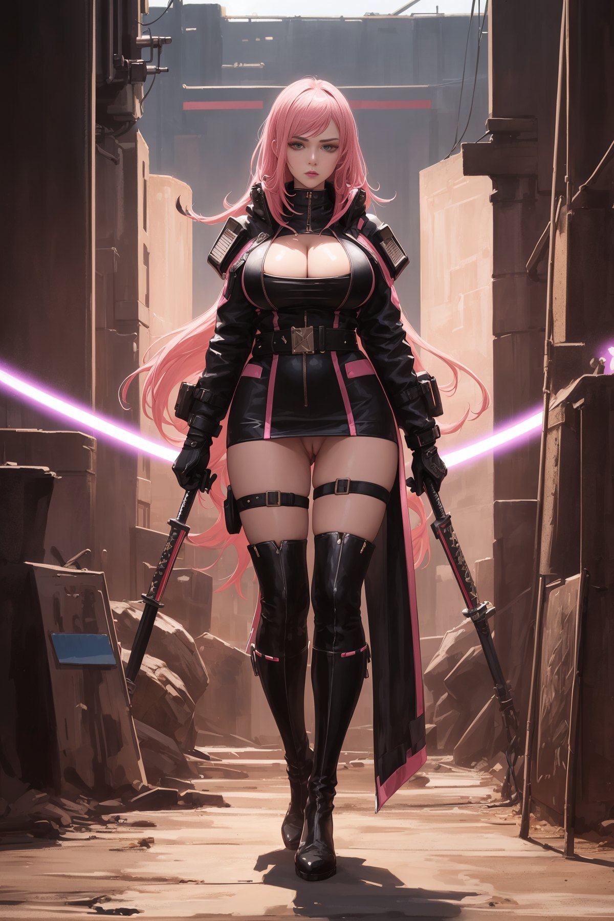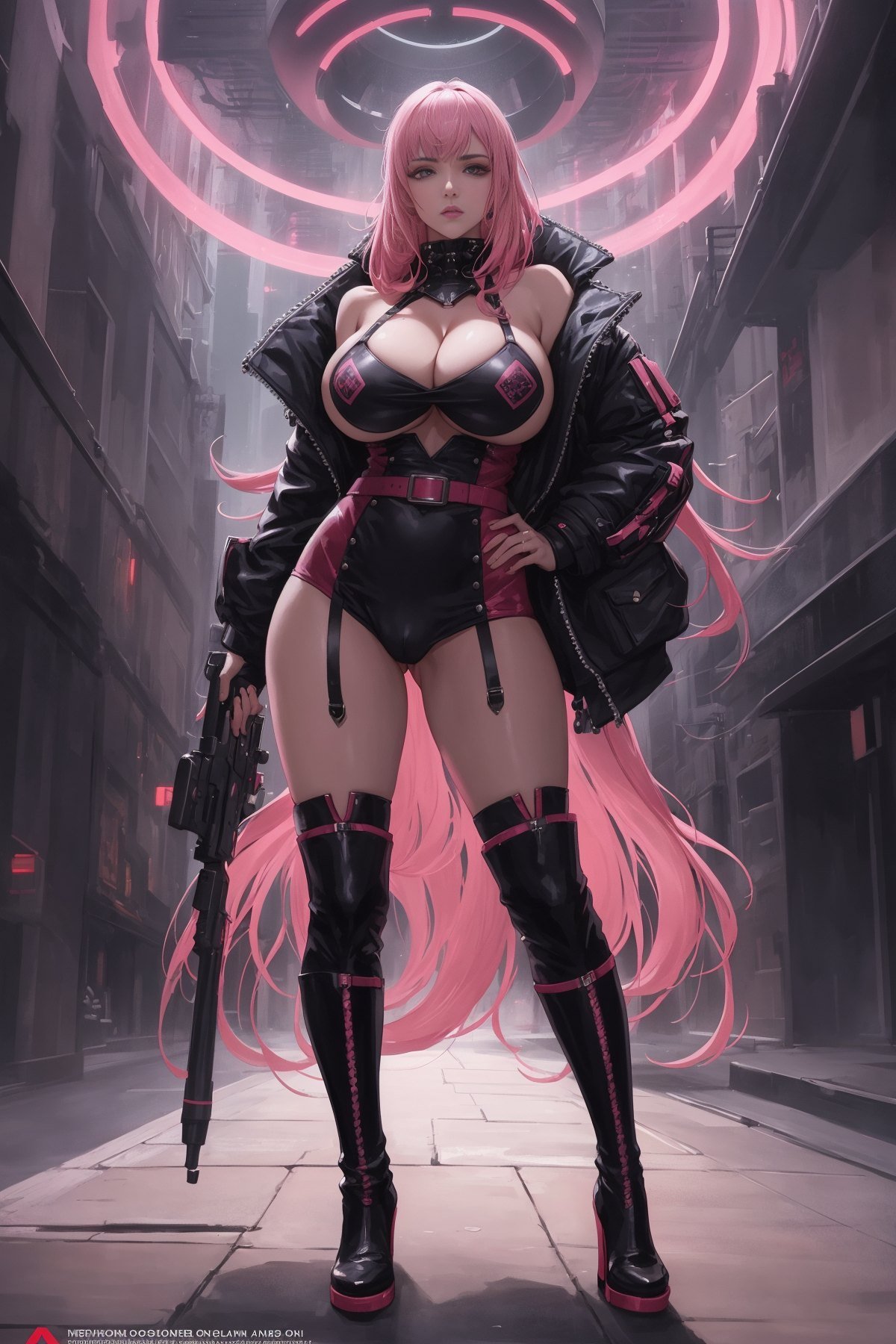 1girl, (full body shot:1.3), a woman standing in front of time machine, space portal, very beautiful cyberpunk samurai, high-end fashion photoshoot, artstation style, planet terror planet, streaming on twitch, dressed with expensive clothes, detective coat, 1 : 1 album artwork, ellora, harumi, pink hair, long hair, pussy, pussy cleavage, big boobs, cleavage, bare thigh, huge boobs, thick thigh, boots, weapon, (masterpiece:1.3), extremely high details, realistic, (best quality:1.3), absurdres, high resolution, hyper-detailed, ray-tracing, sharp focus, vibrant, intricate, sharpness and clarity
