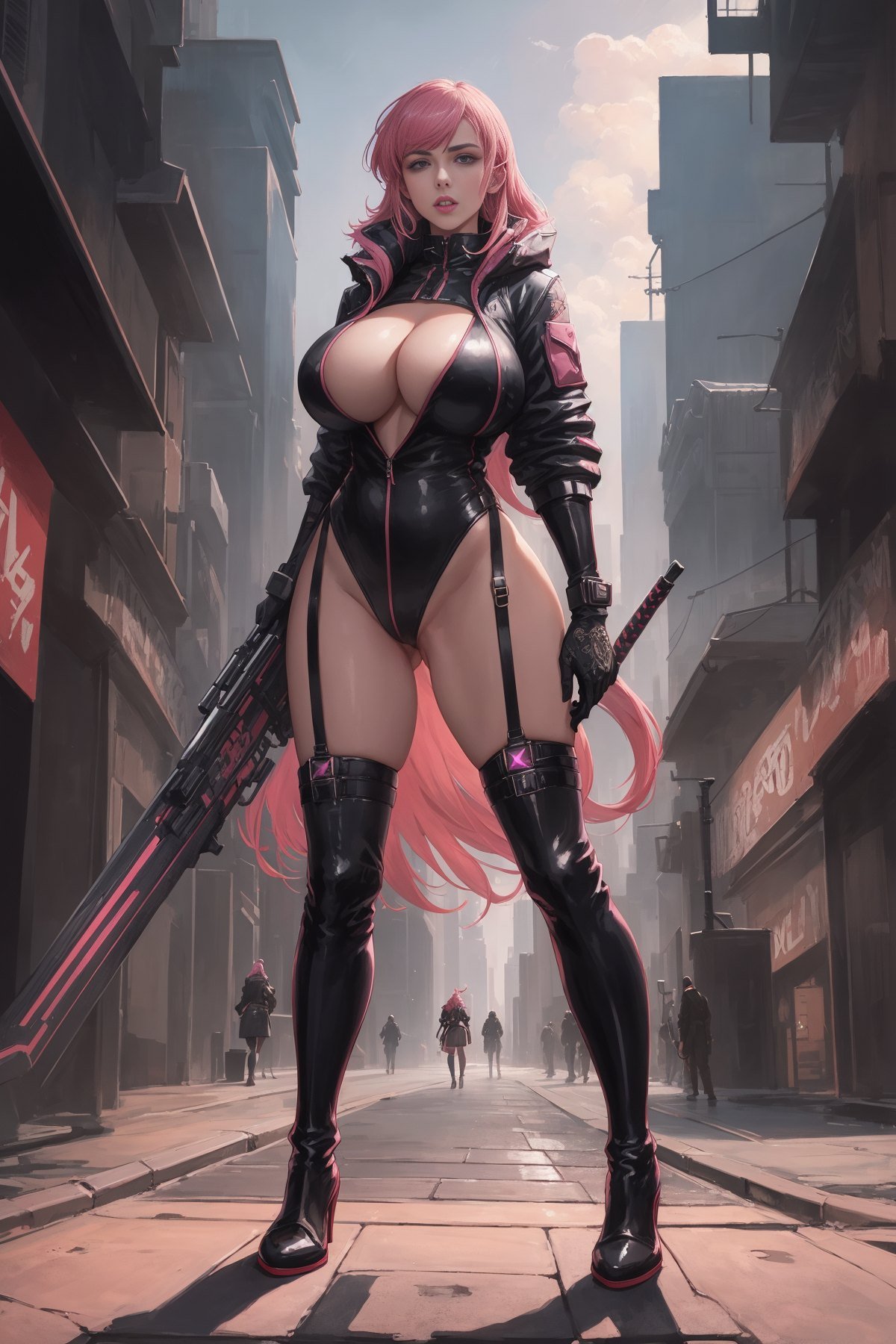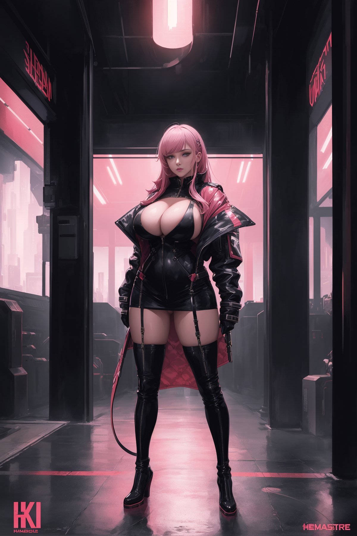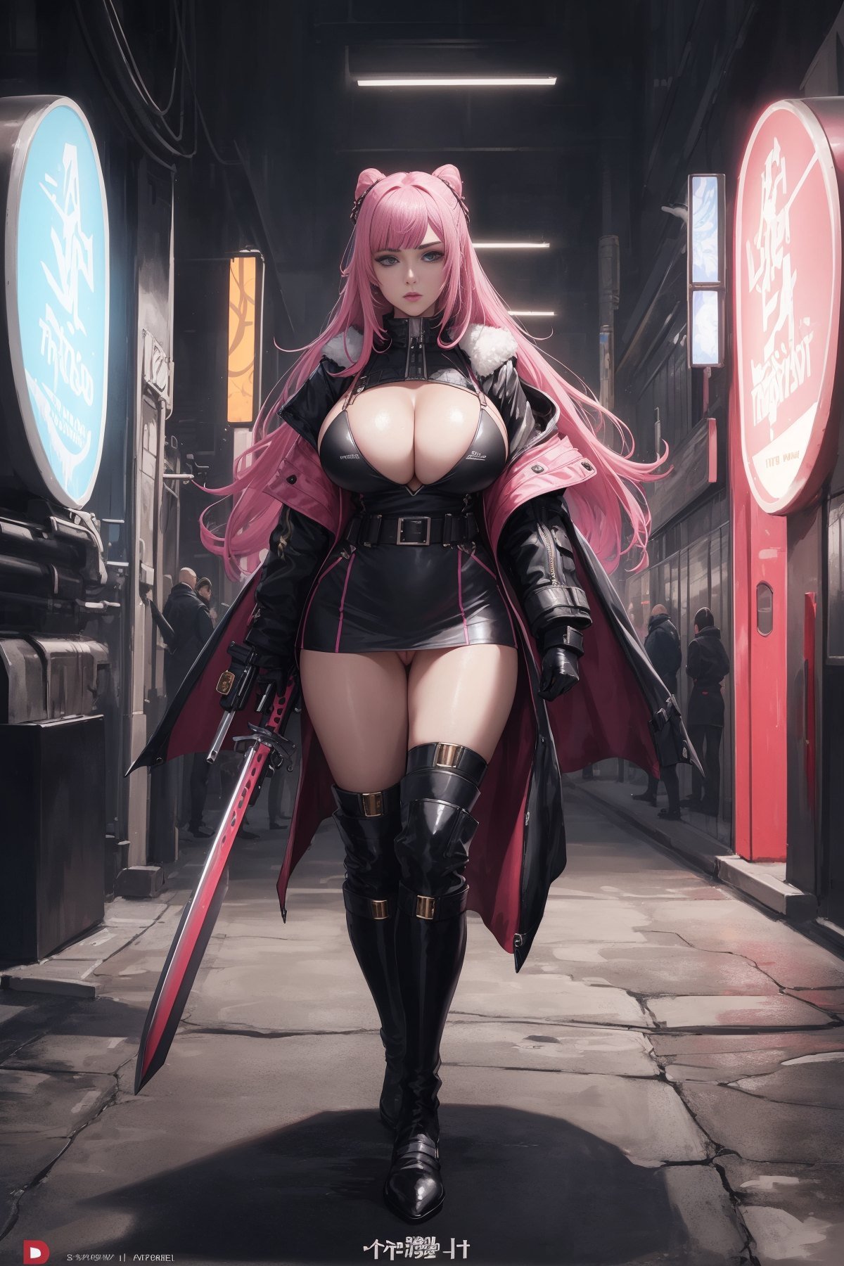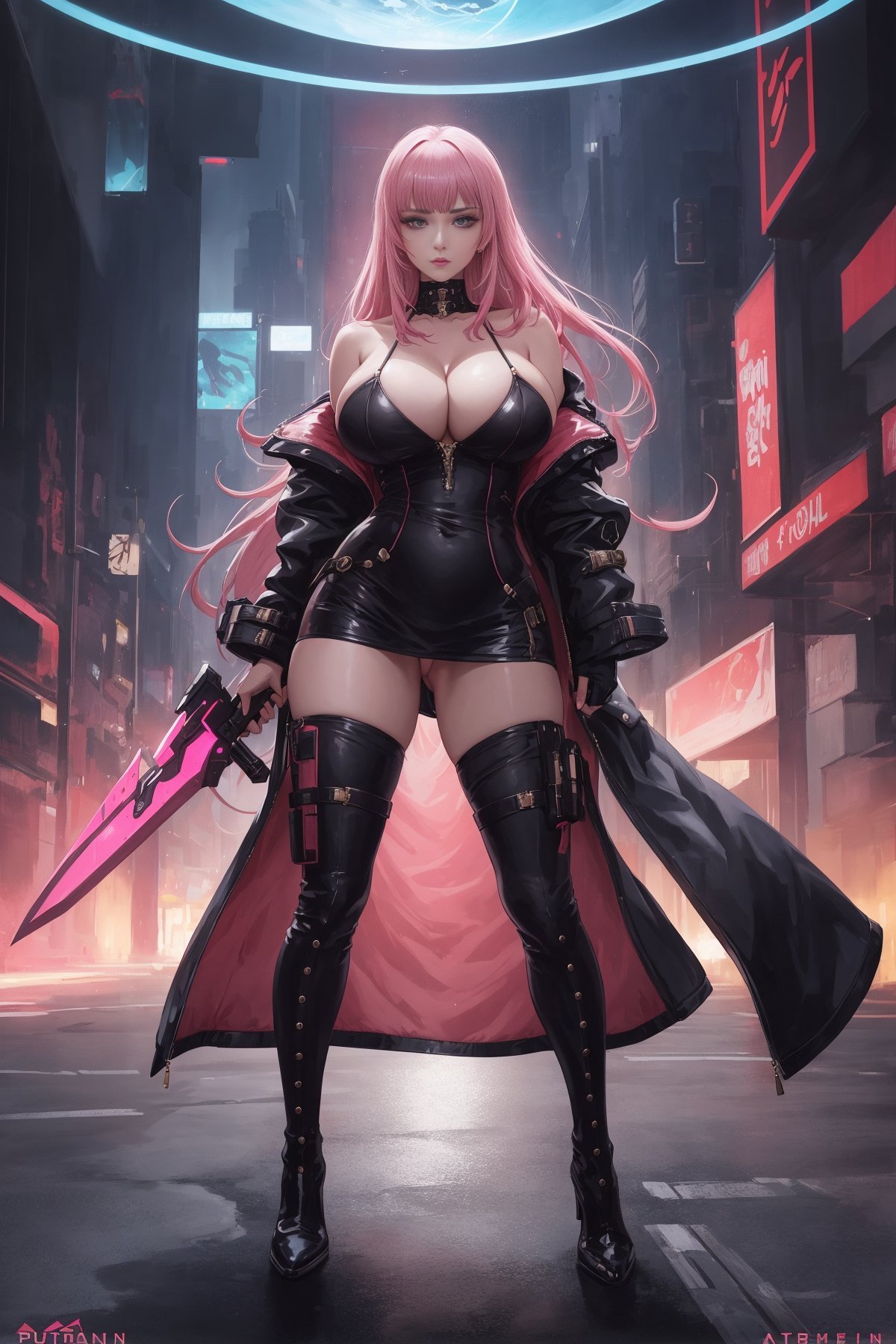 1girl, (full body shot:1.3), a woman standing in front of time machine, space portal, very beautiful cyberpunk samurai, high-end fashion photoshoot, artstation style, planet terror planet, streaming on twitch, dressed with expensive clothes, detective coat, 1 : 1 album artwork, ellora, harumi, pink hair, long hair, pussy, pussy cleavage, big boobs, cleavage, bare thigh, huge boobs, thick thigh, boots, weapon, (masterpiece:1.3), extremely high details, realistic, (best quality:1.3), absurdres, high resolution, hyper-detailed, ray-tracing, sharp focus, vibrant, intricate, sharpness and clarity
