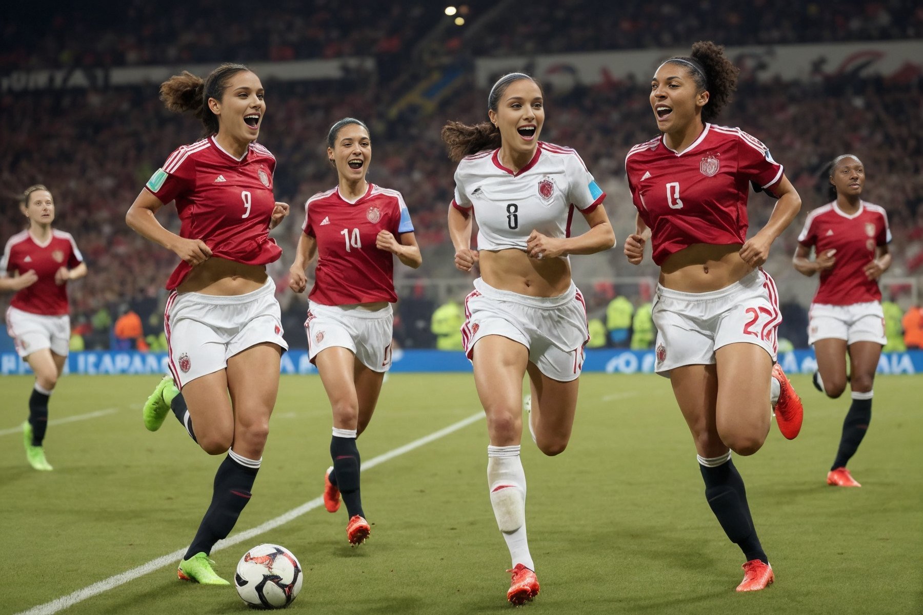 4girls, multiple girls, various skin color, black african, european, american, depict female soccer players running and acclaiming after goal, hooray, jumping, looking at viewer, fifa woman worldcup, Argentina uniform, liftshirt, <lora:shirtliftv3:1>, worldcup soccer game stadium, big breasts, medium breasts, small breasts, nipples, navel, muscular thigh, muscular body, (masterpiece:1.3), extremely high details, (best quality:1.3), absurdres, (photorealistic), realistic, hyper-detailed, ray-tracing, high resolution, sharp focus, 8k, vibrant, intricate, sharpness and clarity, lifelike, hyper_realism