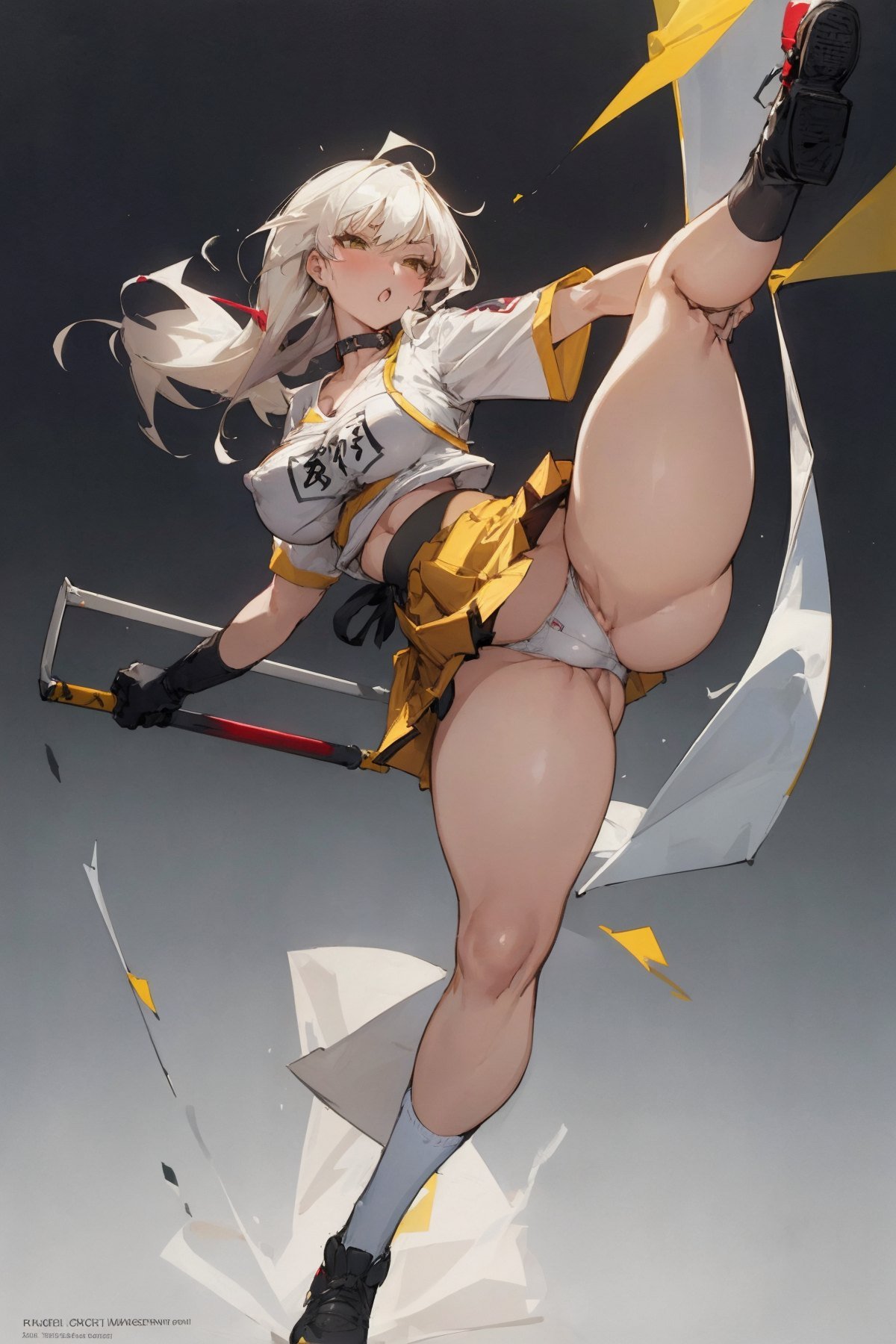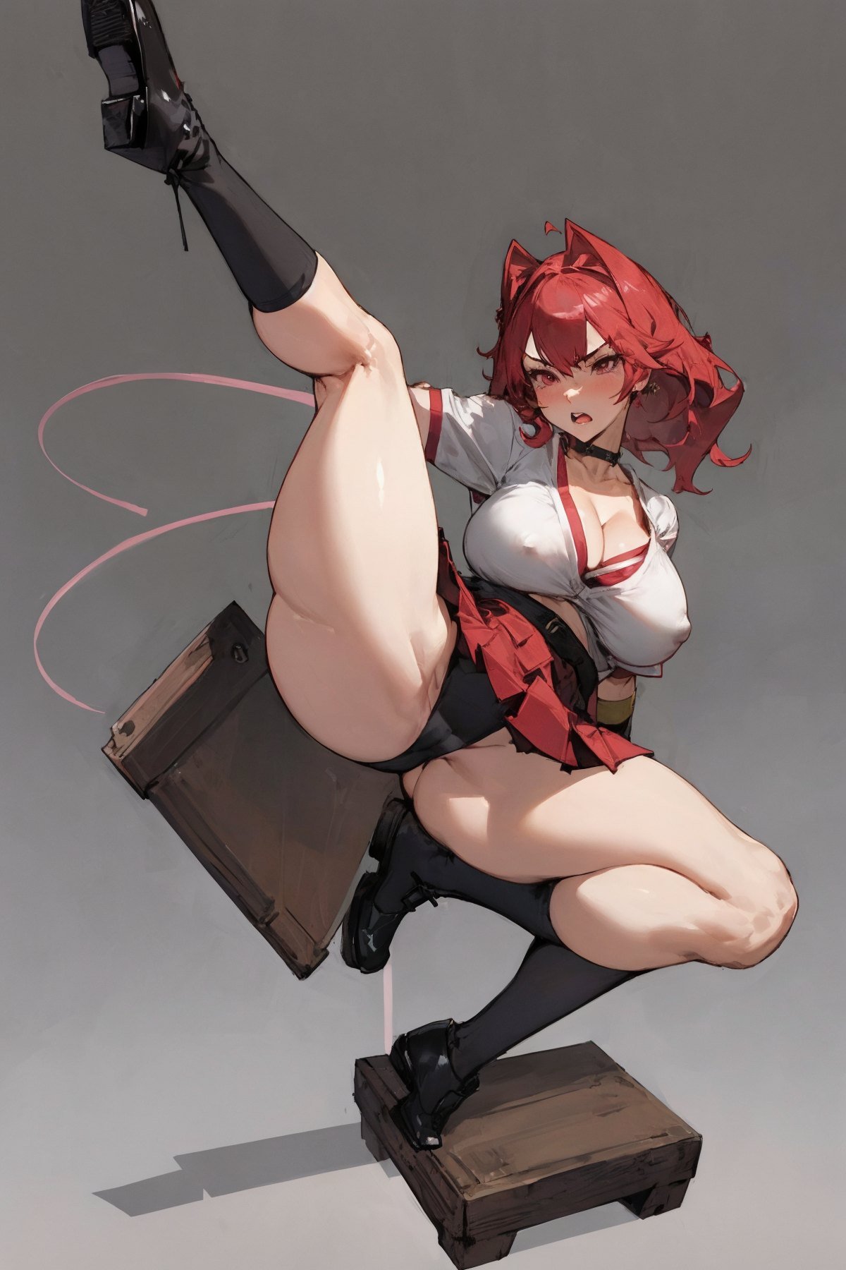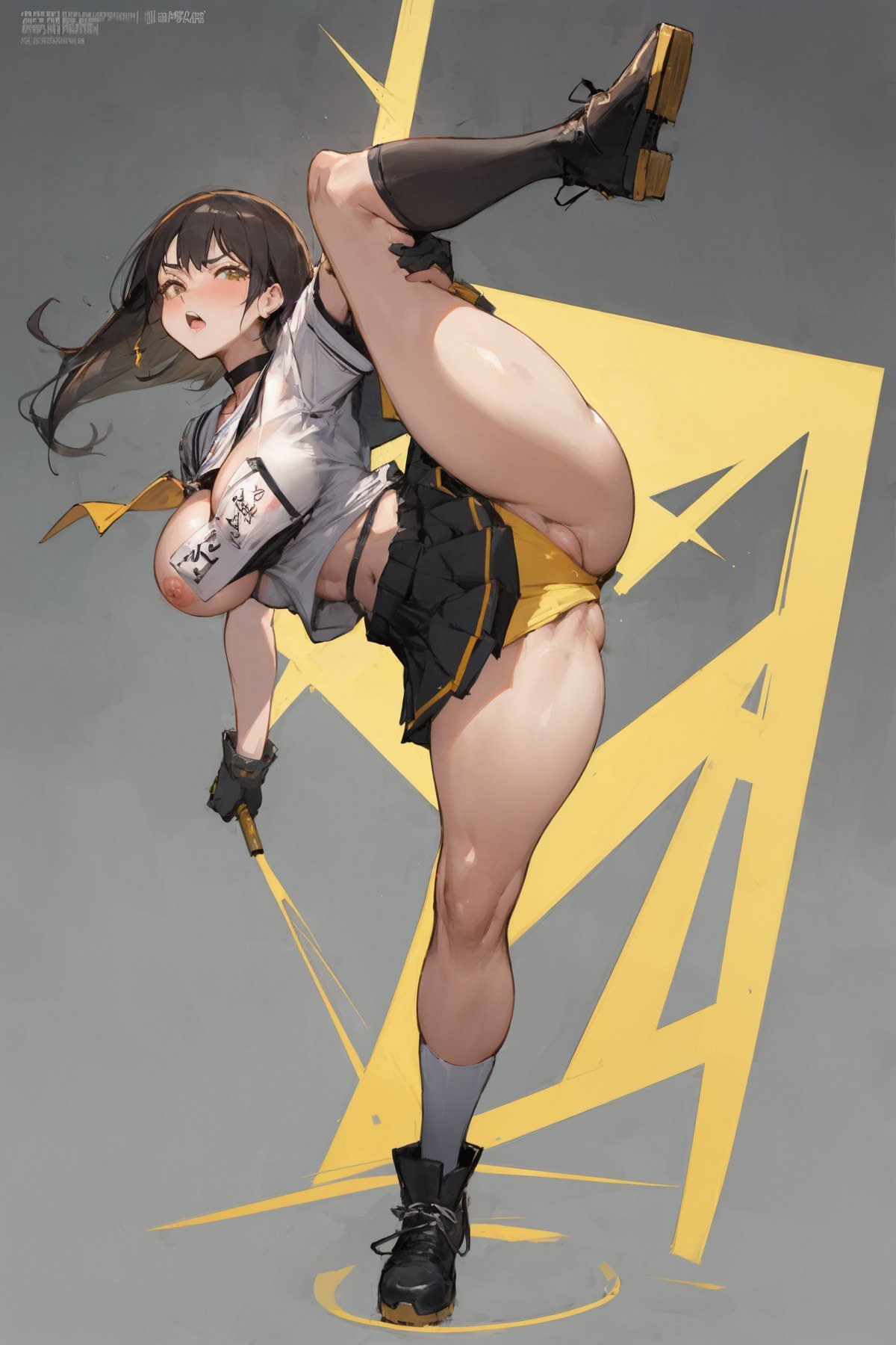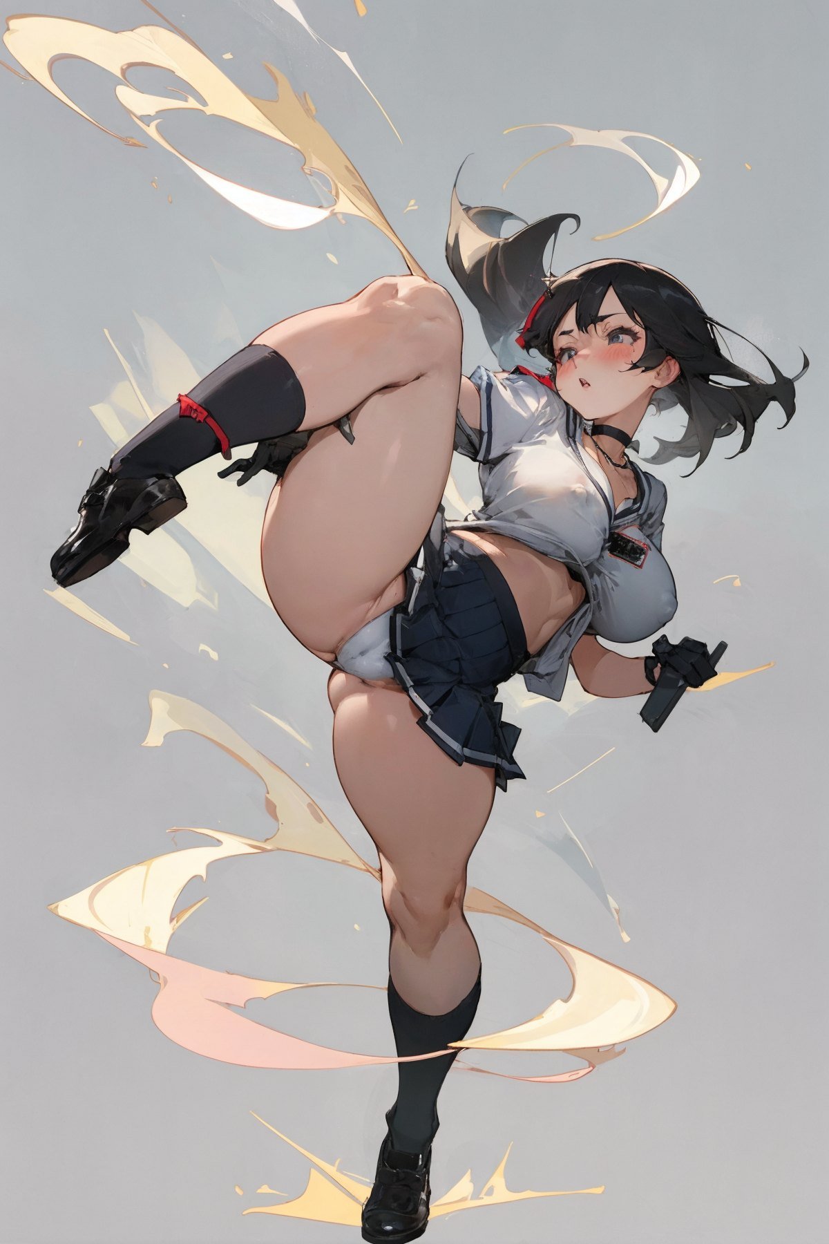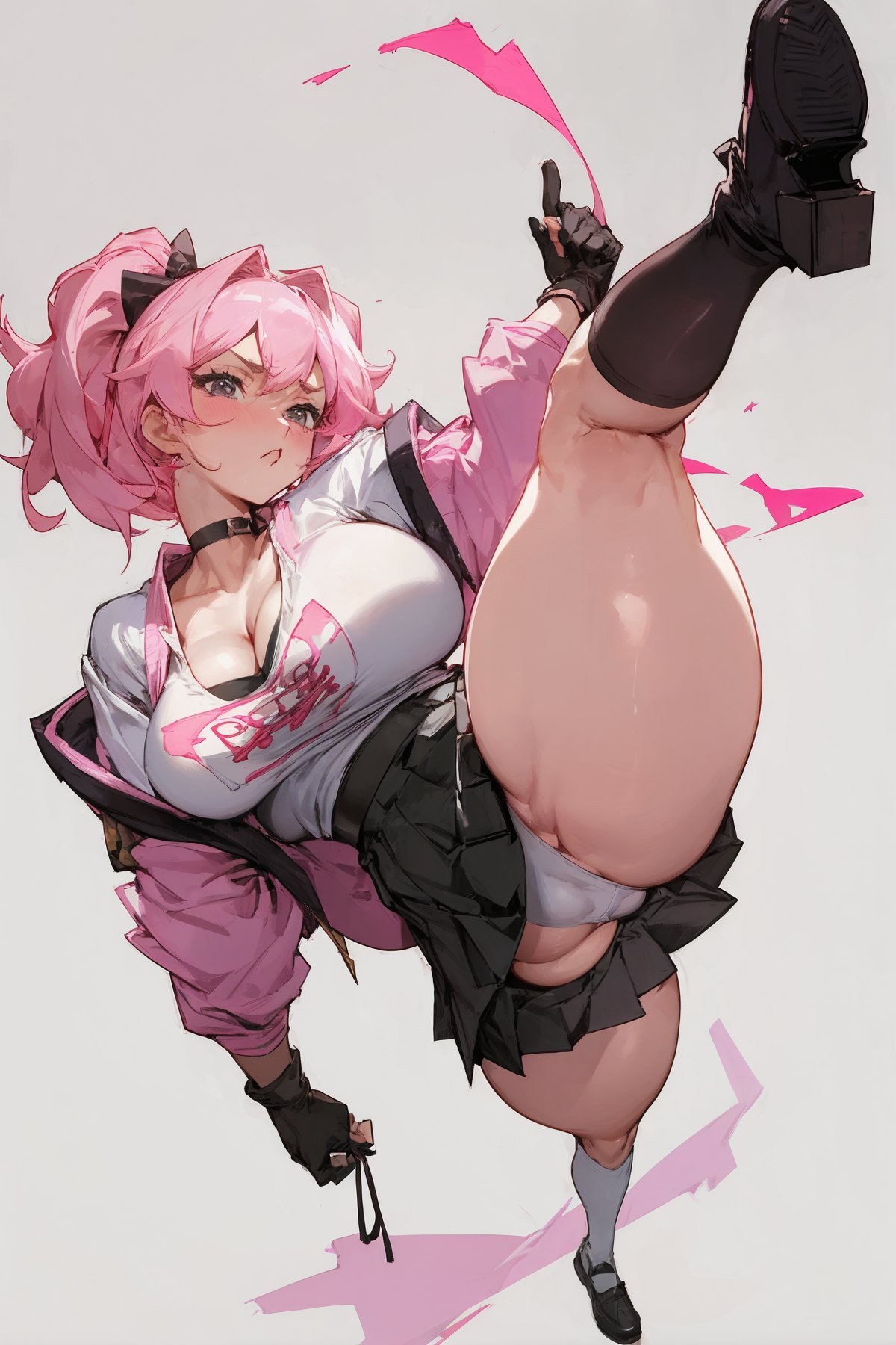 1girl, (full body:1.3), Japanese highschool girls, mature girl kicking leg up, spreading legs, yelling, angry face, booty, busty, huge boobs, big breasts, shirt open, popped-out breasts, cleavage, puffy nipple popped-out, school uniform, white shirt, choker, name tag, gloves, (very short pink pleated mini-skirt:1.2), white panties, cameltoe, pussy cleavage, skirt lifted, knee high black socks, black shoes, thick thigh, (thick legs:1.3), thigh belt, huge asses, ass cheeks, shiny skin, simple background in studio, NSFW, (masterpiece:1.3), extremely high details, (best quality:1.3), absurdres, high resolution, hyper-detailed, ray-tracing, vibrant, intricate, sharpness and clarity