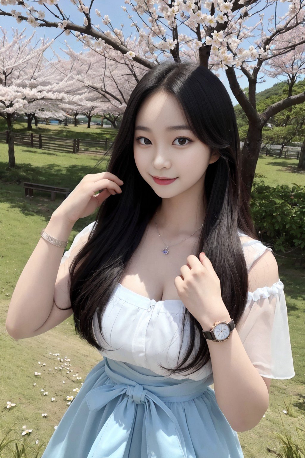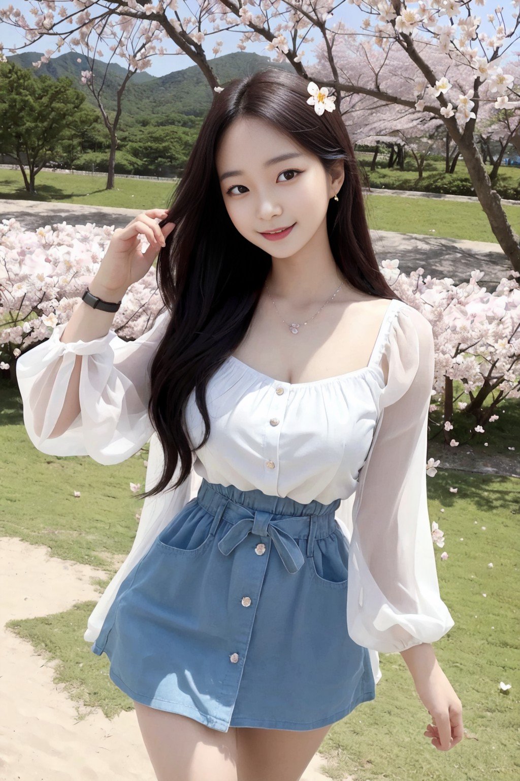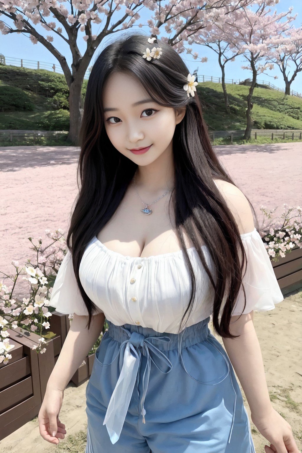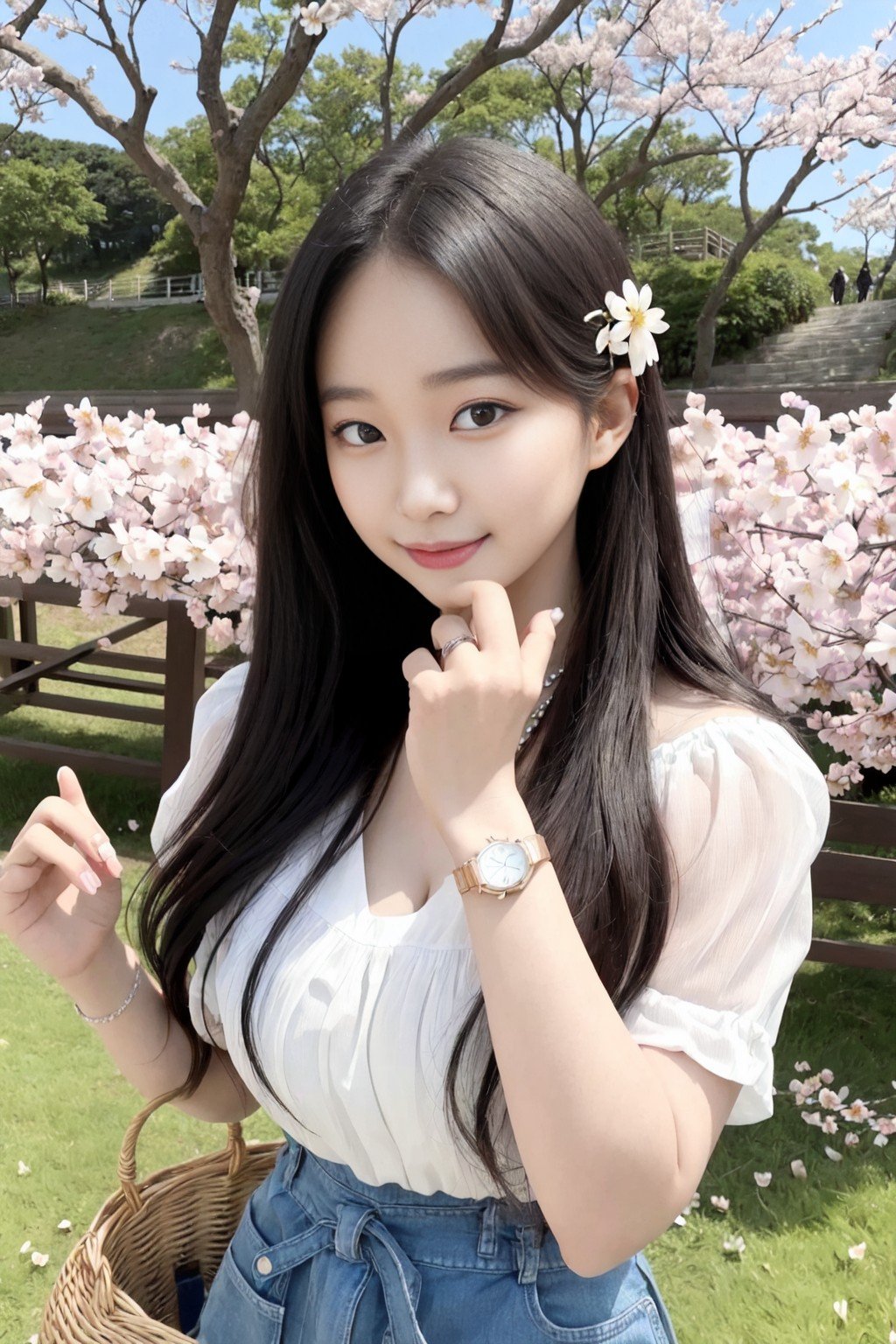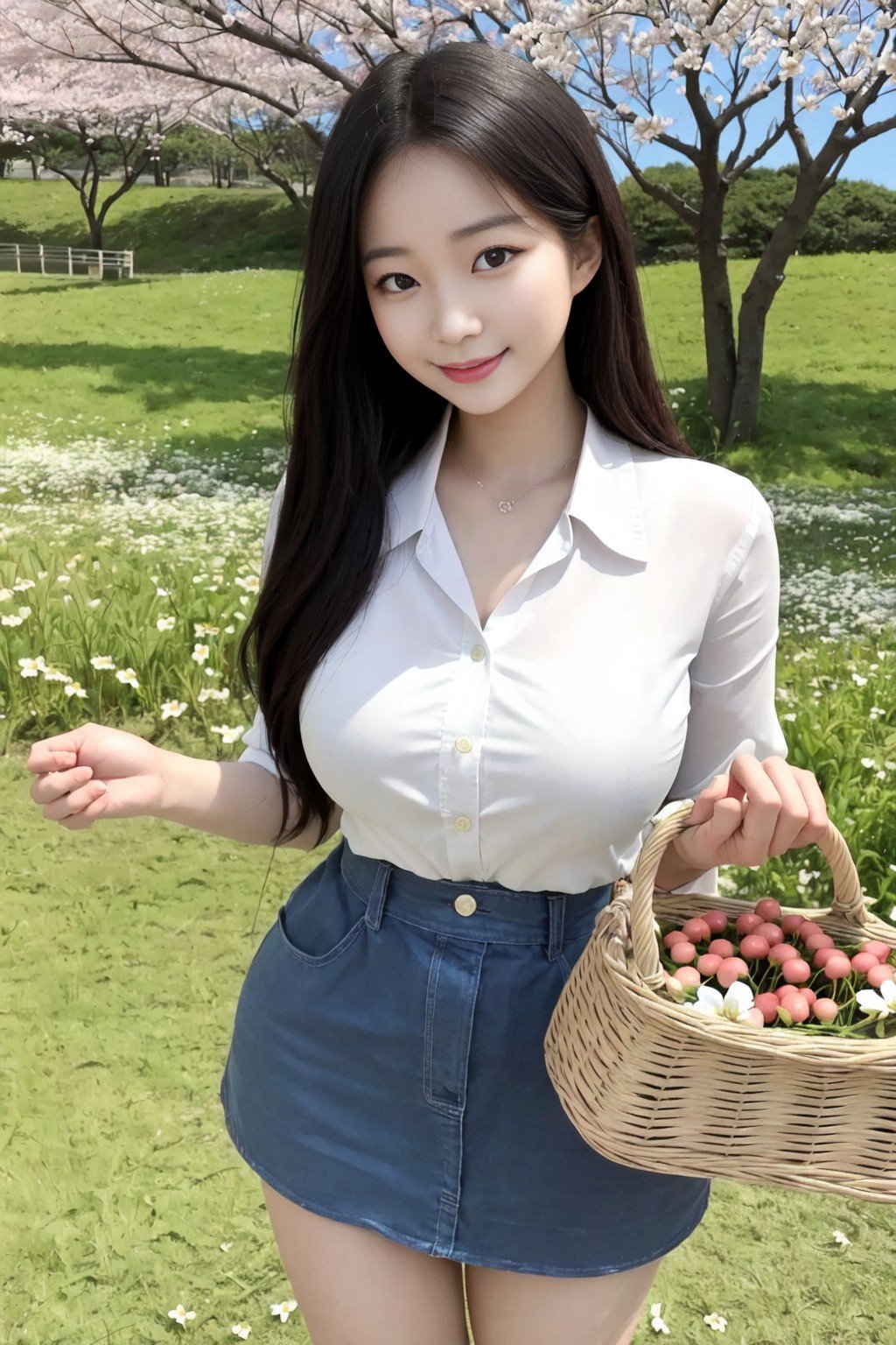 masterpiece, extremely high detail digital RAW color photo, full frame digital photography, photo realistic, best quality, high resolution, absurd res, sharp focus, 8k, vibrant, intricate, sharpness and clarity, lifelike, high-quality HDR, (full shot, full body:1.2), depicting a korean girl going picnic, pose of seiza, pretty face, korean young girl, chubby, chubby body, big breasts, big puffy nipples, nipples pushing on shirts, busty, korean idol, cute korean girl, carrying picnic basket, in spring, light steps, running, smiling, flowers, trees, cherry blossom, a lot of flower, a lot of petals blow in the wind, ocean side, flower field, skin details, slim waist, necklace, finger ring, smart wrist watch, baby face, round face, small face, fat cheek, blush, tight rash guard, tight leggings, white leggings, (white pants:1.0), white spandex pants, short white tank top, button shirts, white shirts, knit cloth shirts, knit texture, texture details, big asses, <lora:koreanDollLikeness_v15:1>